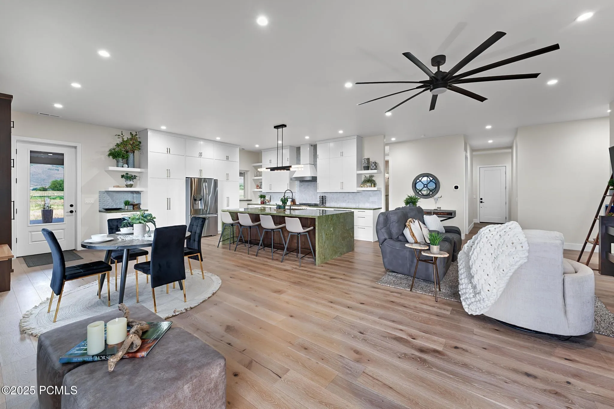 Experience refined country living on 5.86 acres of horse property, tucked away on a private lane in a mostly secluded area, complete with infrastructure for a future 1000 sq foot ADU. This custom estate boasts a show-stopping chef’s kitchen with Wolf and ILVE appliances, a dramatic 10’x5′ Brazilian Seafoam green waterfall island, Hammerton blown glass lighting, and sleek level 5 cabinetry with brass accents. The owner’s suite is a serene sanctuary with mountain-view patio access, a spa-inspired bath with freestanding tub, Seafoam green granite shower, and custom closet with laundry hook-up. Covered patio is already plumbed for a Hot Tub outside the primary suite, Wide-plank hardwood floors, soaring 8′ solid-core doors, remote control shades, and wrap-around patios with designer outdoor lighting elevate the home’s modern elegance. A remarkably massive 6,000 sq ft garage/shop with commercial doors, private office, loft, spray-foam insulation, and full bath offers endless possibilities for outdoor recreationalists with plenty of snowmobiles, UTVs and toys, car collectors, hobbyists, or to operate your business right out of the garage. With dual meters, two transformers, well water, propane, and RV hookups, this property combines luxury, functionality, privacy, and the freedom to expand-an exceptional lifestyle opportunity.