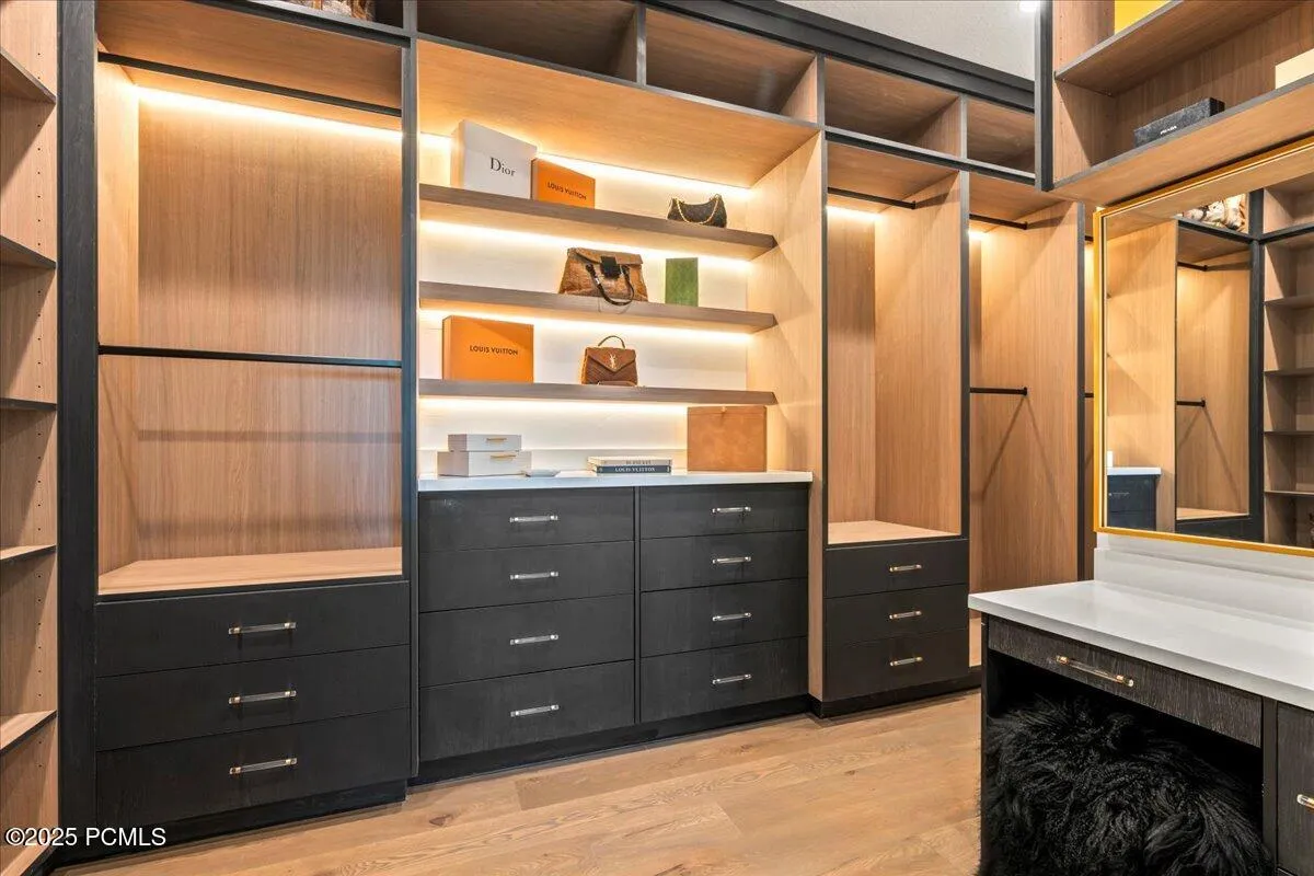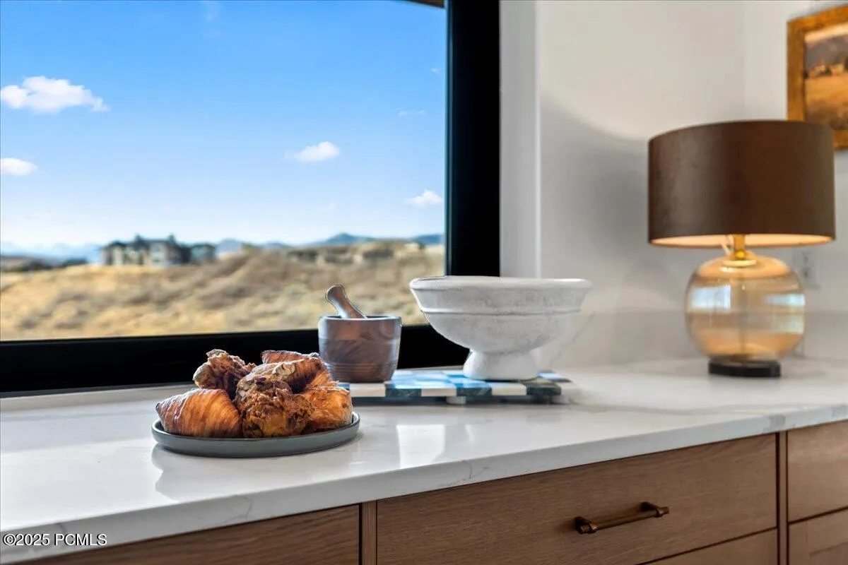There is a stillness in this home — Curandera, meaning ”to heal” — that you feel the moment you arrive. Blessed and energetically reset by a local shaman, this home was curated with intention to hold positive energy, creating a grounded and restorative retreat. Soaring ceilings, natural textures, and clean modern lines frame sweeping Tuhaye mountain vistas through telescoping and accordion glass doors. Warm woods, refined stonework, and a dramatic wood-paneled feature wall enhance the metal-and-glass staircase. Statement fireplaces, radiant heated floors throughout, subtle Western influences, and designer wallpapers add depth and sophistication. The artisan kitchen features white oak cabinetry, Sub-Zero appliances, a large island, butler’s pantry, and an unexpected passage to a private casita with its own snack station and ensuite. The main level primary suite offers a bespoke wood installation, fluted-travertine fireplace, boutique LED-lit closet, and spa-inspired bathroom. Secondary bedrooms include custom closets and private ensuites, including a cheerful Jack-and-Jill layout. The daylight walkout lower level includes heated concrete floors, a large family/game room with wet bar, a storefront-glass flex room, and two additional bedrooms. Outdoor living features expansive decks, a lower patio, and an outdoor hot tub positioned for year-round relaxation. Set on 2.65 acres, the property offers privacy, subtle golf course views, and panoramas of the Uintah Mountains and Mount Timpanogos. Located in the gated Tuhaye community with a full Talisker Club membership –this is elevated mountain living designed to let you breathe deeper and exhale fully.