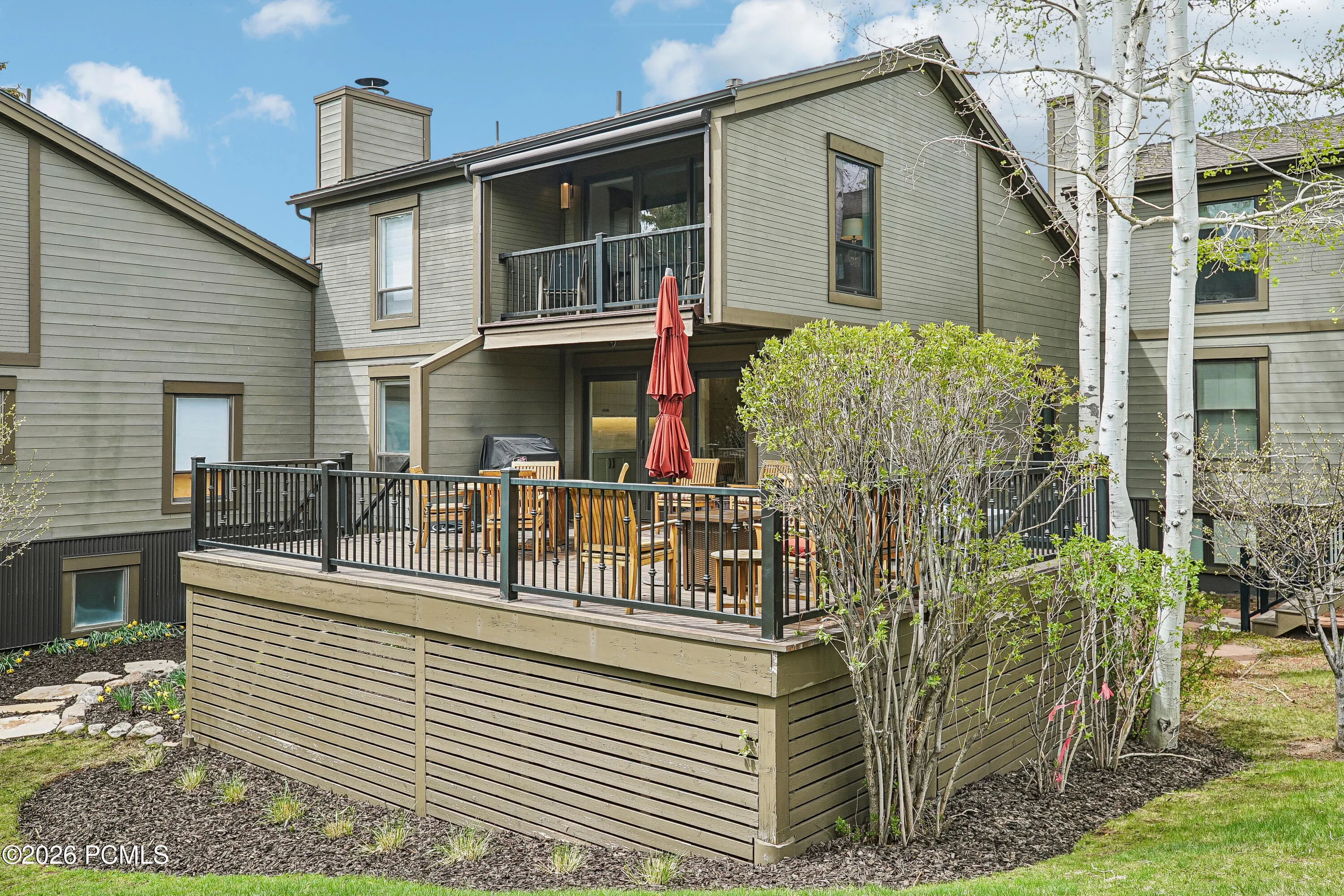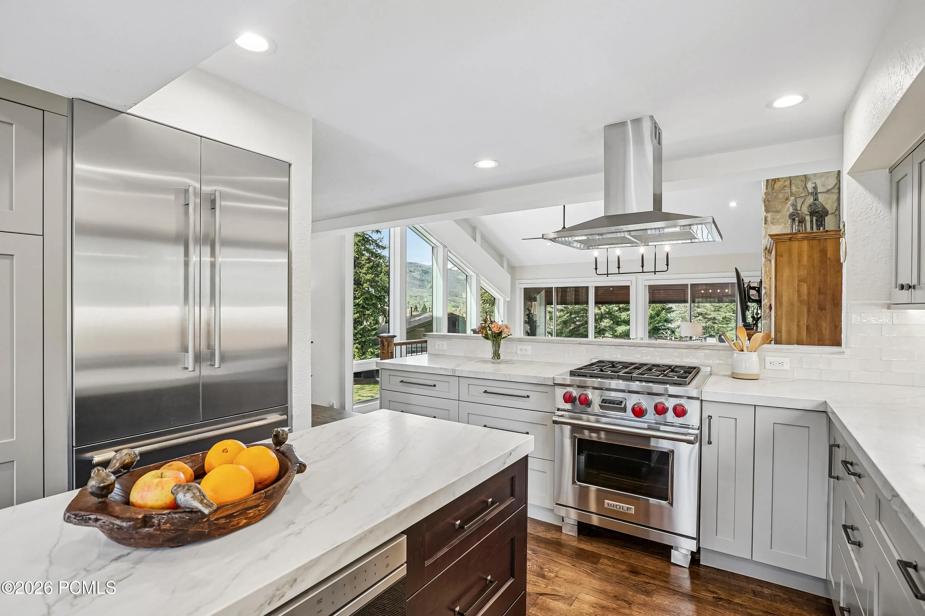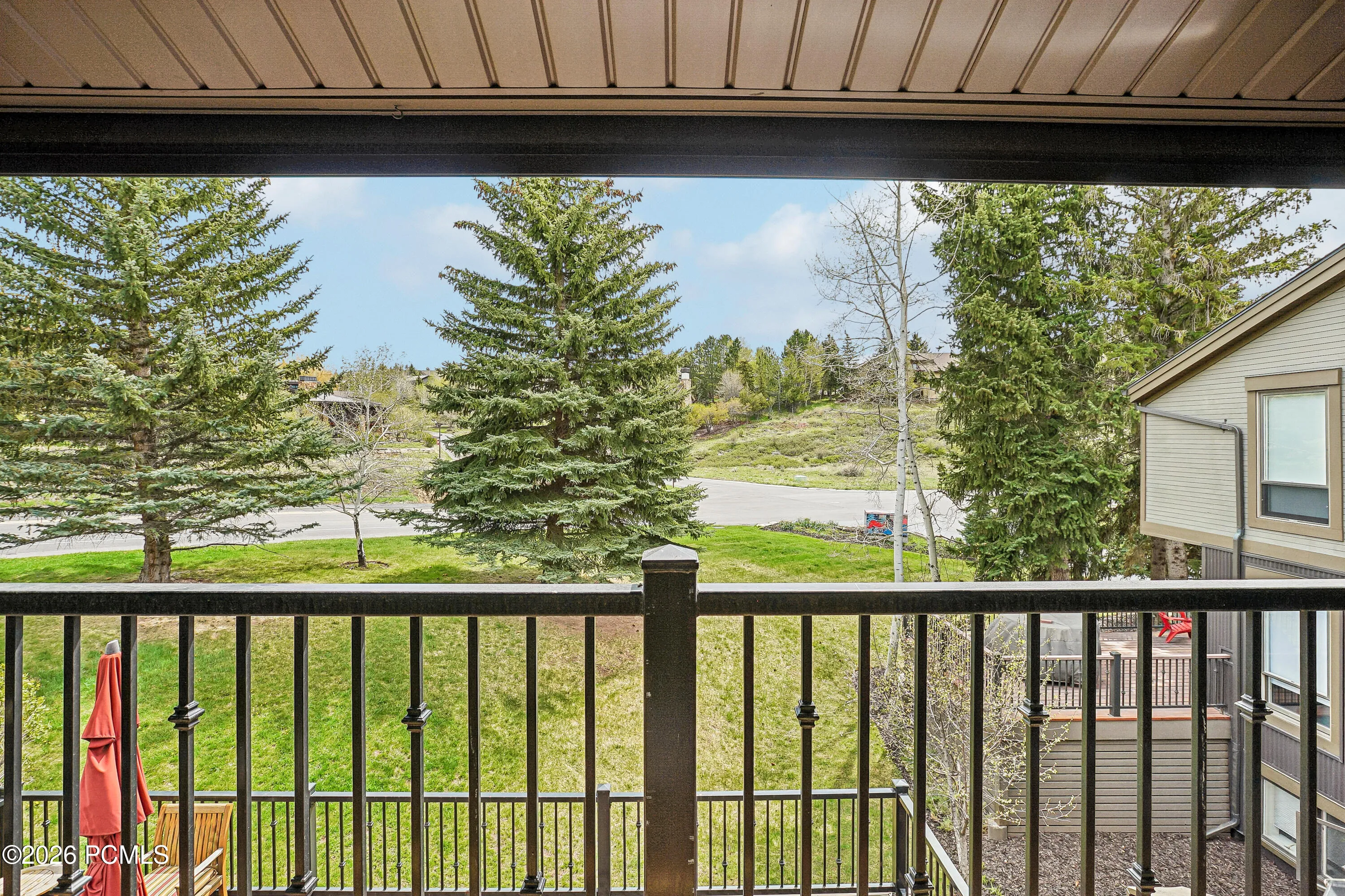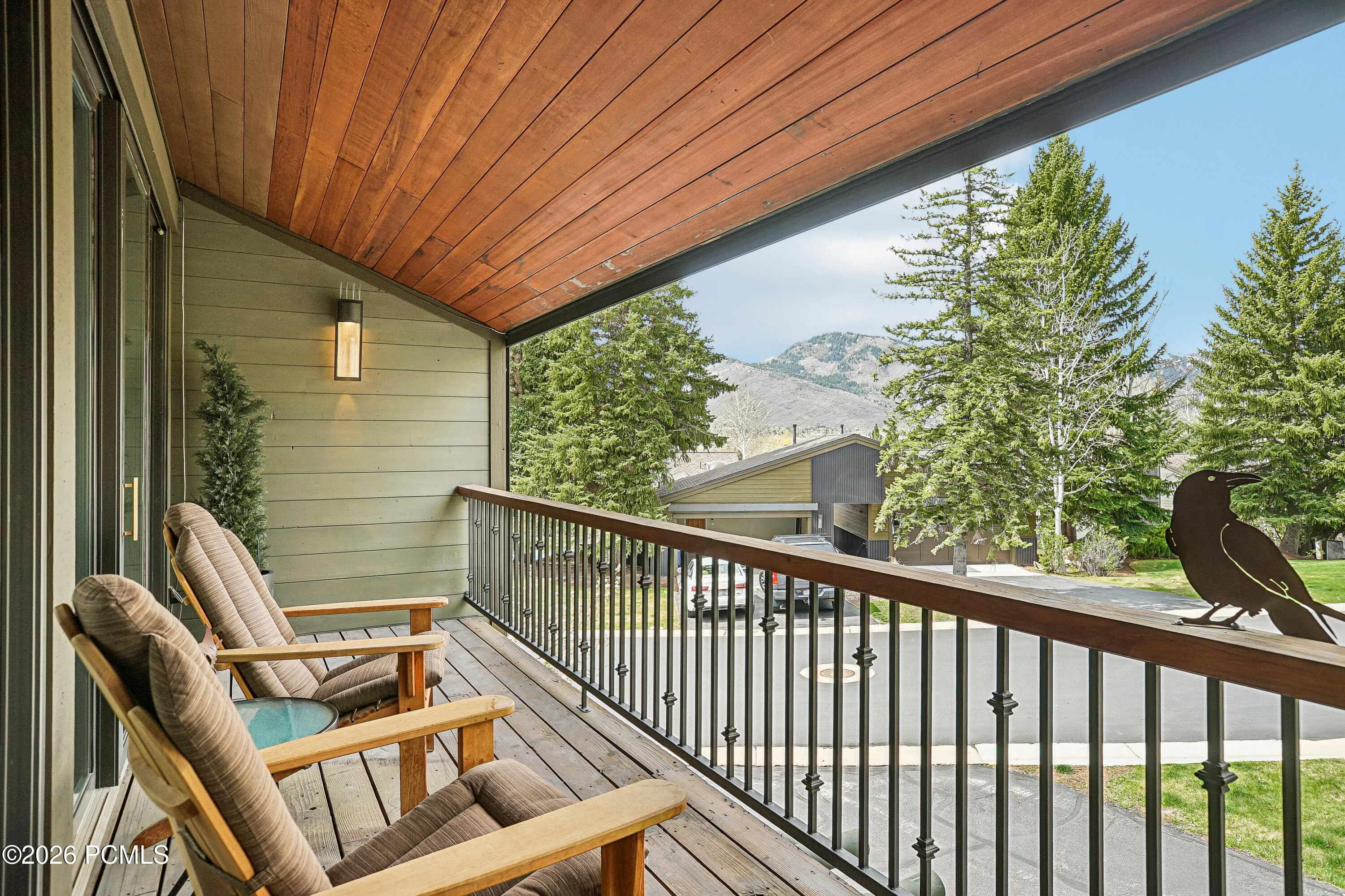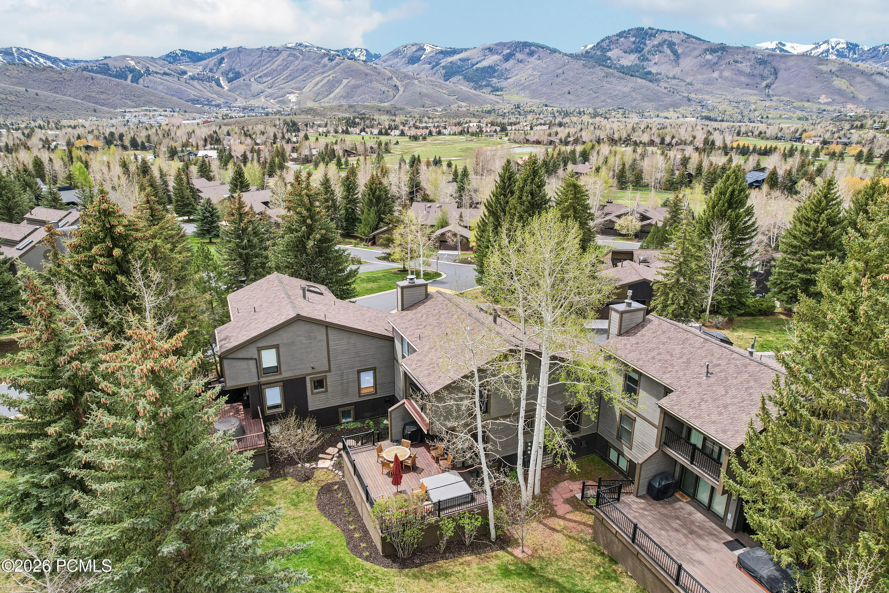 This four-bedroom, four-bathroom Fairway Village townhome delivers an exceptional combination of luxury finishes, sweeping mountain views, and a versatile floor plan in the heart of sought-after Park Meadows. Thoughtfully upgraded throughout and nestled among mature aspens and pines, the home lives like a single-family residence. It sits just steps from Park Meadows Country Club, Round Valley’s 2,000+ acres of open space and trails, and ”wave-down” free transit to Park City Mountain Resort, Deer Valley, and historic Main Street.The heart of the home is the dramatic main-level great room — soaring vaulted ceilings with exposed wood beams, a floor-to-ceiling stone fireplace, and an entire wall of windows framing direct ski run views that stop you in your tracks. The space flows seamlessly into the dining area and connects to both a covered front balcony and an expansive back deck. The fully renovated chef’s kitchen is a standout: Wolf range, Sub-Zero refrigerator, quartz countertops, custom shaker cabinetry, subway tile backsplash, and a built-in wine refrigerator in the breakfast nook — all with direct access to the outdoors. The back deck is a wonderful area for entertaining and relaxing — nearly 500 square feet, with a private hot tub, fire table, and gas grill, surrounded by mature trees and open space.The top-level primary suite is a true sanctuary: vaulted ceiling, private covered balcony, and bath featuring a dual vanity with backlit LED mirror, soaking tub, travertine walk-in shower with bench and skylight, and a custom walk-in closet with built-in cabinetry. The fourth bedroom on this level is outfitted with custom built-ins and also lives beautifully as a home office or flex space.The entry level functions as a self-contained guest suite — a generous lounge with custom built-in bunks, private queen bedroom, full bathroom, laundry, and two-car garage with storage. Nightly rentals are allowed. Don’t miss this incredible Park Meadows townhome!